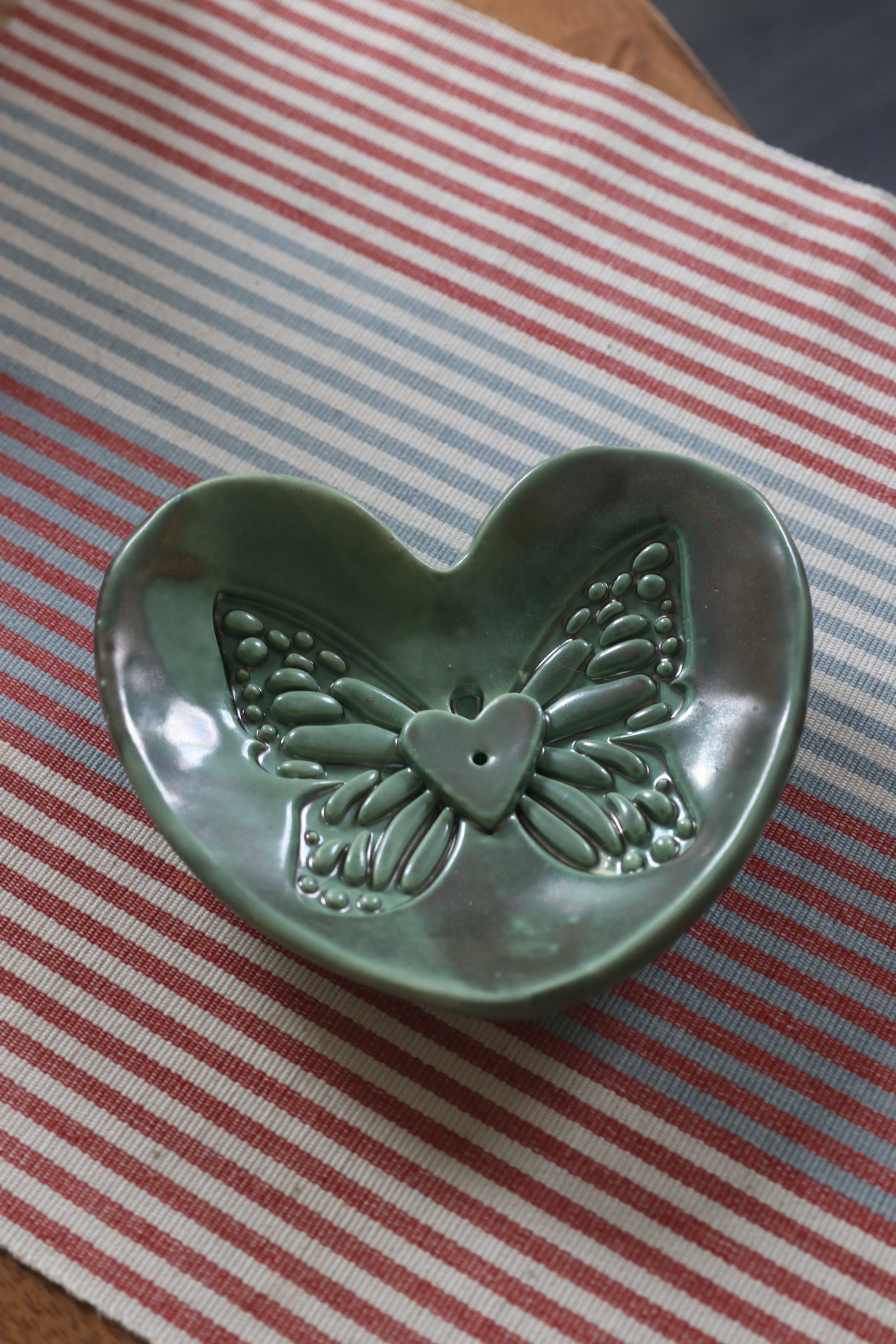 Here is our first-ever custom incense bowl for SHE! Made by talented local artist, Gigi Van Hove, she uses a mixture of copper metallic coloured glaze along with the green you are accustomed to seeing from the SHE branding colour palette. This ceramic piece looks incredible in any light and dazzles on the altar.